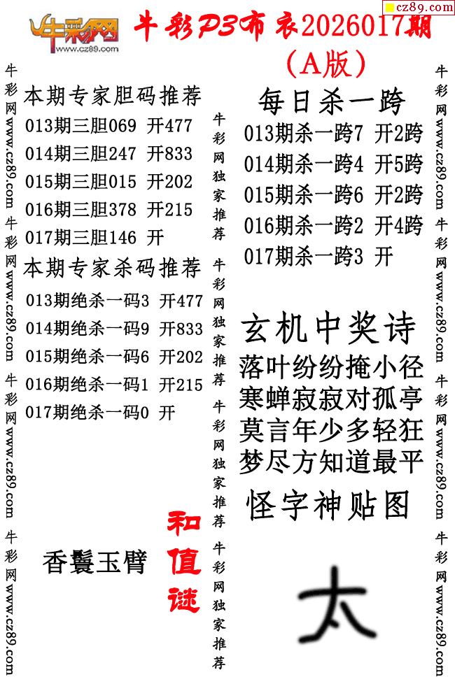 牛彩P3布衣26年017期AB版图谜(精华版)-3d试机号走势图_今天3d试机号金码_3d和值走势带连线|杀号走势